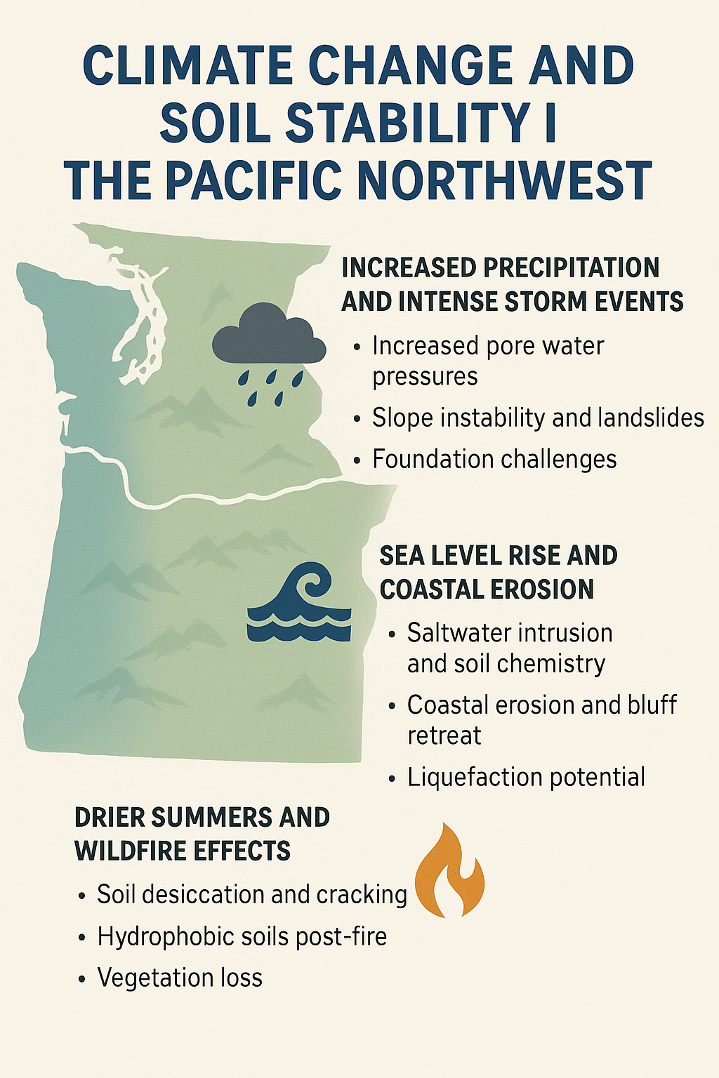 Climate change is no longer a distant concern—its effects are being felt now, and geotechnical engineers are on the front lines of addressing its implications. In the Pacific Northwest (PNW), a region known for its diverse terrain and variable climate, shifts in precipitation patterns, rising sea levels, and changing temperature regimes are beginning to alter soil behavior in significant ways. Understanding and adapting to these changes is essential for maintaining infrastructure safety and resilience.